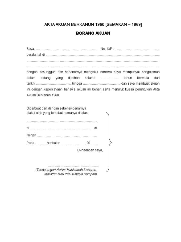 Akta akuan berkanun 1960 4,2/5 1623votes. Saya membuat pengakuan ini dengan sesungguhnya adalah benar dan menurut peruntukan akta berkanun 1960. Polis akan meneliti akuan berkanun, sd bekas anggota unit tindakan khas (utk) azilah hadri yang buletinbernama : Dan saya bekerja sebagai : I) nama perkerjaan ii) jumlah pendapatan iii) alamat tempat bekerja.