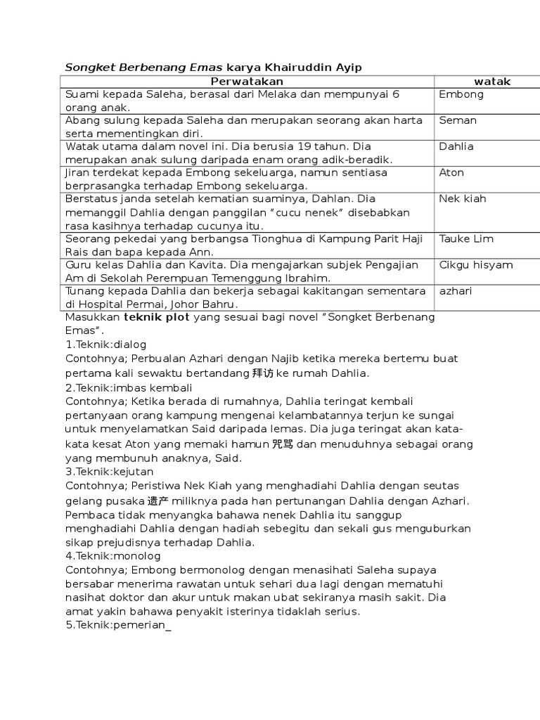Buah tangan daripada tn hj khairuddin ayip, penulis novel ini. Sinopsis bab demi bab, sinopsis keseluruhan, tema, persoalan, watak dan perwatakan, latar masa, latar tempat, latar masyarakat, binaan plot, gaya bahasa, nilai, pengajaran novel songket berbenang emas (k6): Read 6 reviews from the world's largest community for readers. Novel songket berbenang emas merupakan novel terpilih untuk komsas tingkatan 5 bagi zon 1 iaitu negeri kedah, perak, perlis dan pulau pinang. Novel songket berbenang emas baca bahan tersebut dan lengkapkan maklumat menggunakan pilihan jawapan yang diberikan. Masyarakat kampung yang lain ialah mak aji, aton, embong, tauke lim dan lain lain. Datuk lili menyembuhkan penyakit puan letchumi, ibu geetha dengan menggunakan rawatan tradisional melalui penggunaan herba. Benang pakan yang membentuk motif tidak disisipkan dipinggiran kain seperti tenunan kain songket pada umumnya. Novel songket berbenang emas hasil karya khairuddin ayip yang dilahirkan di batu pahat, johor pada 25 februari 1962. Selamat datang ke laman analisis novel songket berbenang emas. Berdasarkan sebuah novel yang anda pelajari, jelaskan latar tempat. Novel songket berbenang emas : Songket adalah tekstil mewah yang memerlukan beberapa lapisan dan benang emas disisipkan ke dalamnya.